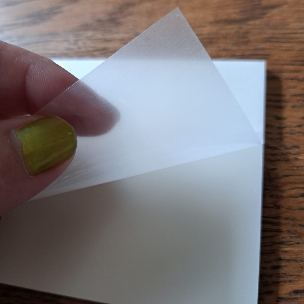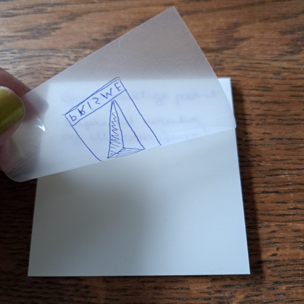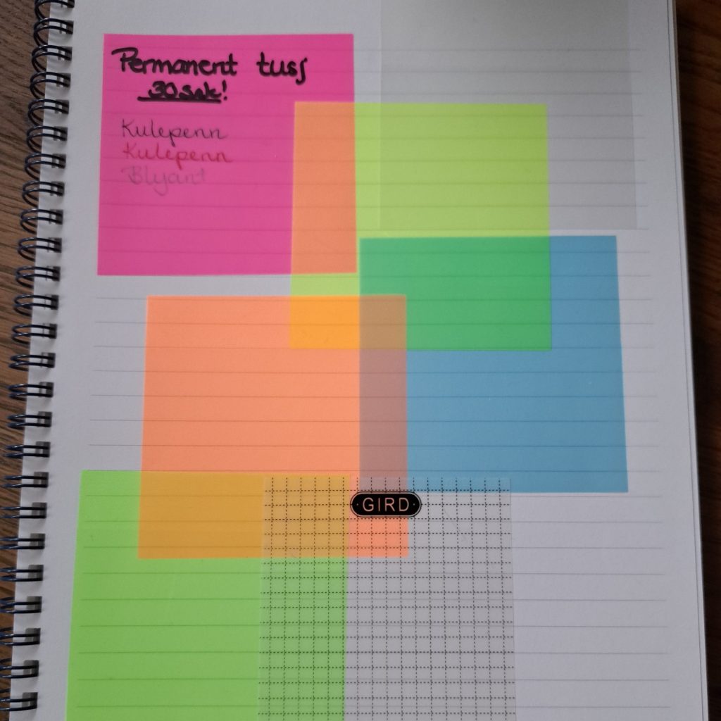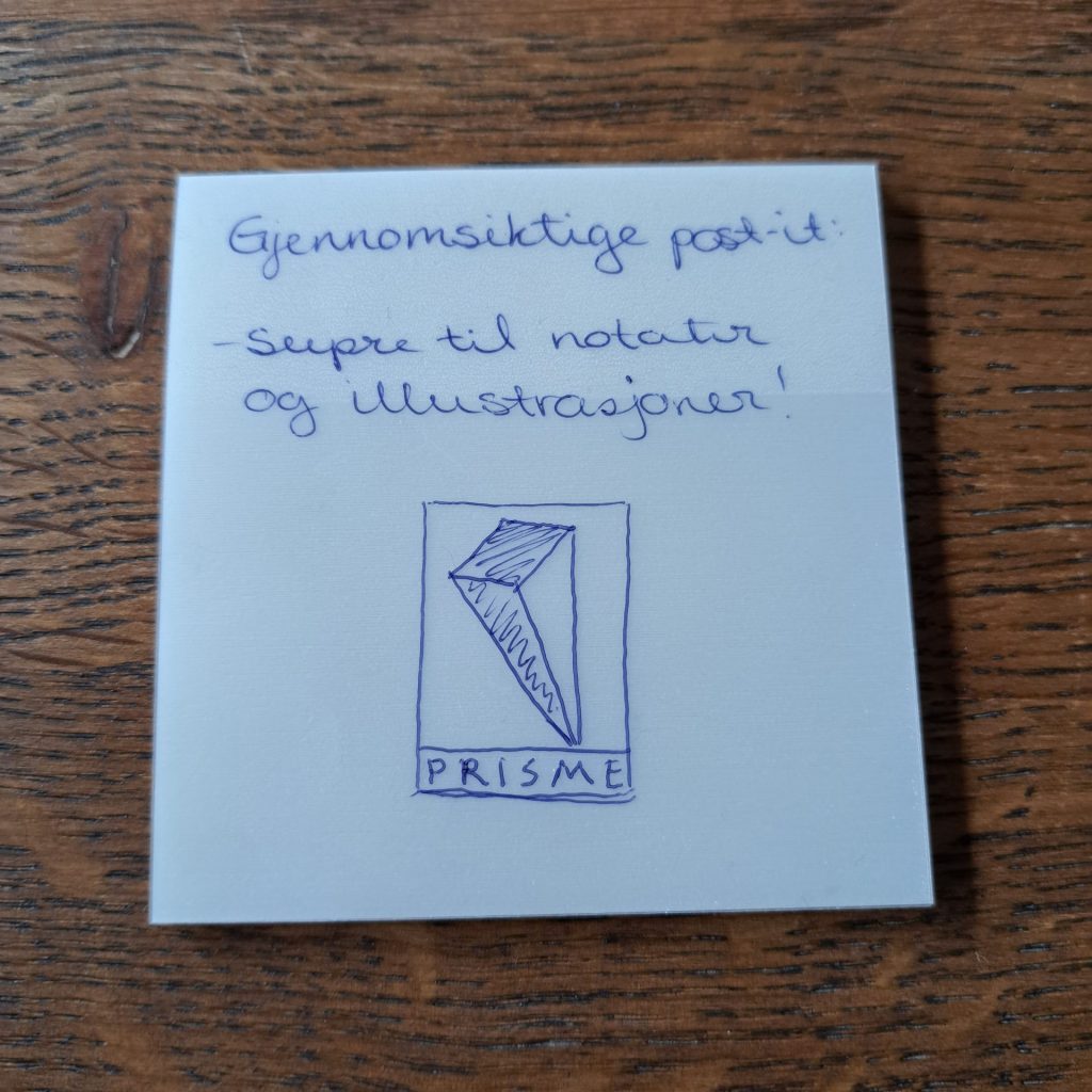 Gjennomsiktige post-it. 50 ark i hver pakke. Gode å skrive på. Virker med både penn, blyant og permanent tusj. Tusj-lignende penner kan i noen tilfeller flyte utover.