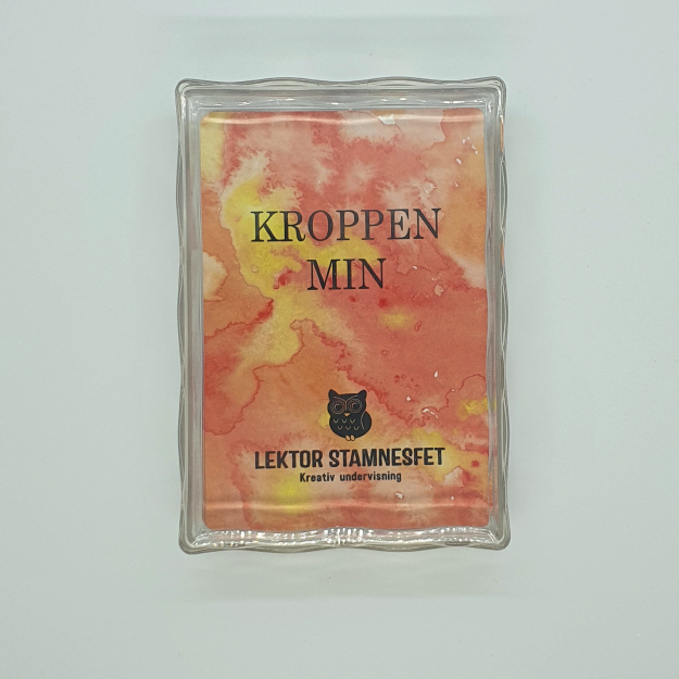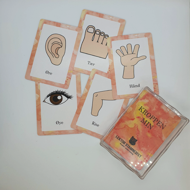 Kortstokk med 18 kort om kroppen og ulike kroppsdeler. Kortstokken er fin å bruke som del av begrepslæring og visualisering av kroppen. Kortene kan brukes både for å snakke om kropp, skrive om kropp, og for å spille med dem, f.eks. som i alias.
