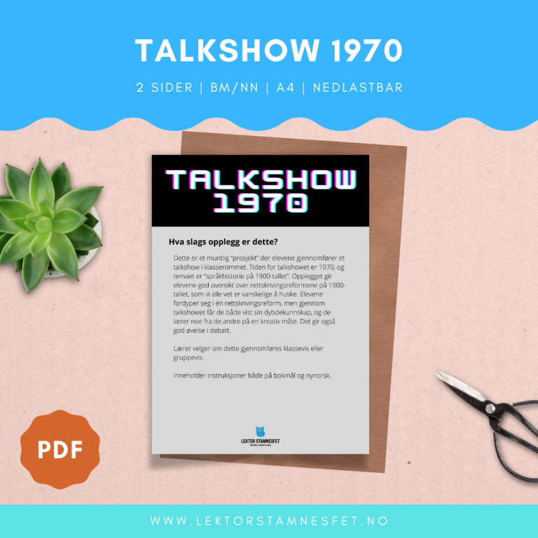 Dette er et muntlig «prosjekt» der elevene gjennomfører et talkshow i klasserommet. Tiden for talkshowet er 1970, og temaet er «språkhistorie på 1900-tallet». Opplegget gir elevene god oversikt over rettskrivingsreformene på 1900-tallet, som vi alle vet er vanskelige å huske. Elevene fordyper seg i én rettskrivingsreform, men gjennom talkshowet får de både vist sin dybdekunnskap, og de lærer noe fra de andre på en kreativ måte. Det gir også god øvelse i debatt.